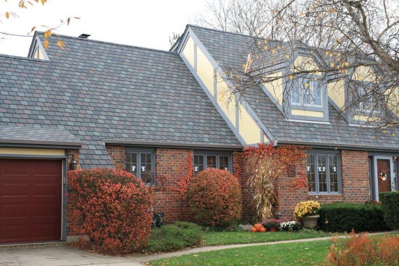 Каждый лепесток гонта имеет свой индивидуальный оттенок, а общий вид кровли смотрится благородно и лаконично. Такой вид натуральная сланцевая кровля приобретает лишь по прошествии нескольких лет.